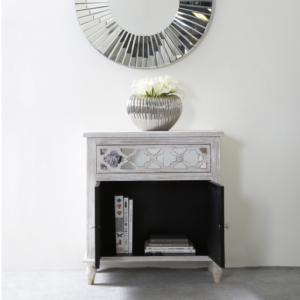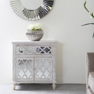The Hampton Beach 1 door 2 drawer cabinet is inspired by the understated elegance of a New England beach home. Featuring a washed ash effect finish, the spacious doors and drawer are beautifully enhanced by mirror overlayed with intricate fretwork detailing and crystal handles.